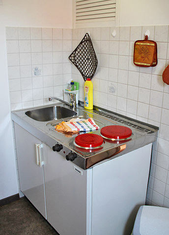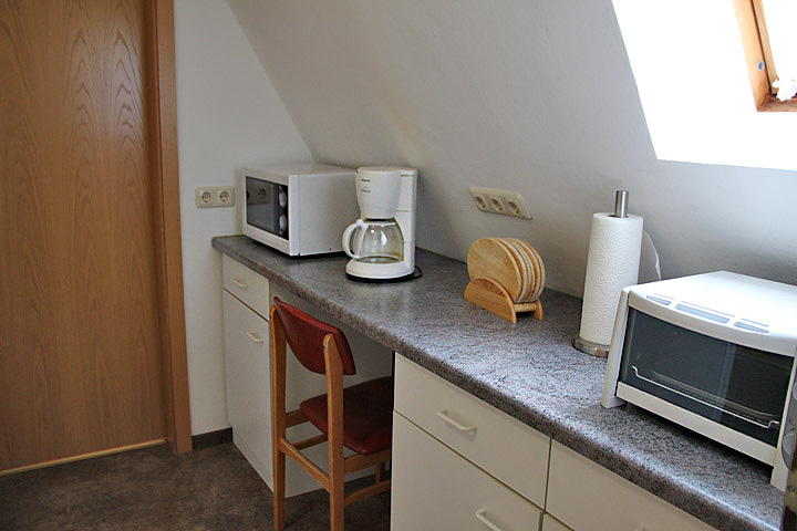 - Küche mit Kühlschrank, Kaffeemaschine, Mikrowelle, Wasserkocher, Toaster, Elektroherd (2-Kochplatten)